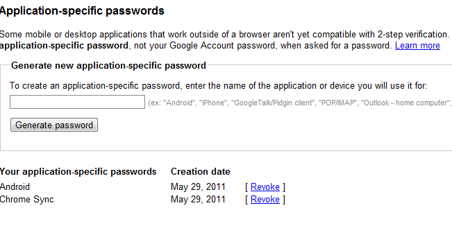 Dupa ce ti-i activat smecheria asta, te pui sa iti faci “Application-specific password” care e o chestie foarte foarte tare. Poti sa iti setezi o parola kaos de grea si de ne-spart per aplicatie. Parola asta se introduce o singura data, deci nu o sa trebuiasca sa o tineti minte. Eu spre exemplu mi-am generat 2 parole specifice pentru ANDROID si pentru Sincronizarea cu Google Chrome. Faza SI MAI SMECHERA este ca poti sa anulezi respectivele parole si sa setezi altele cand ti se scoala tie. Pot da “Revoke acces” si e un lucru foarte util daca stii ca te-ai lasat pe undeva logat.