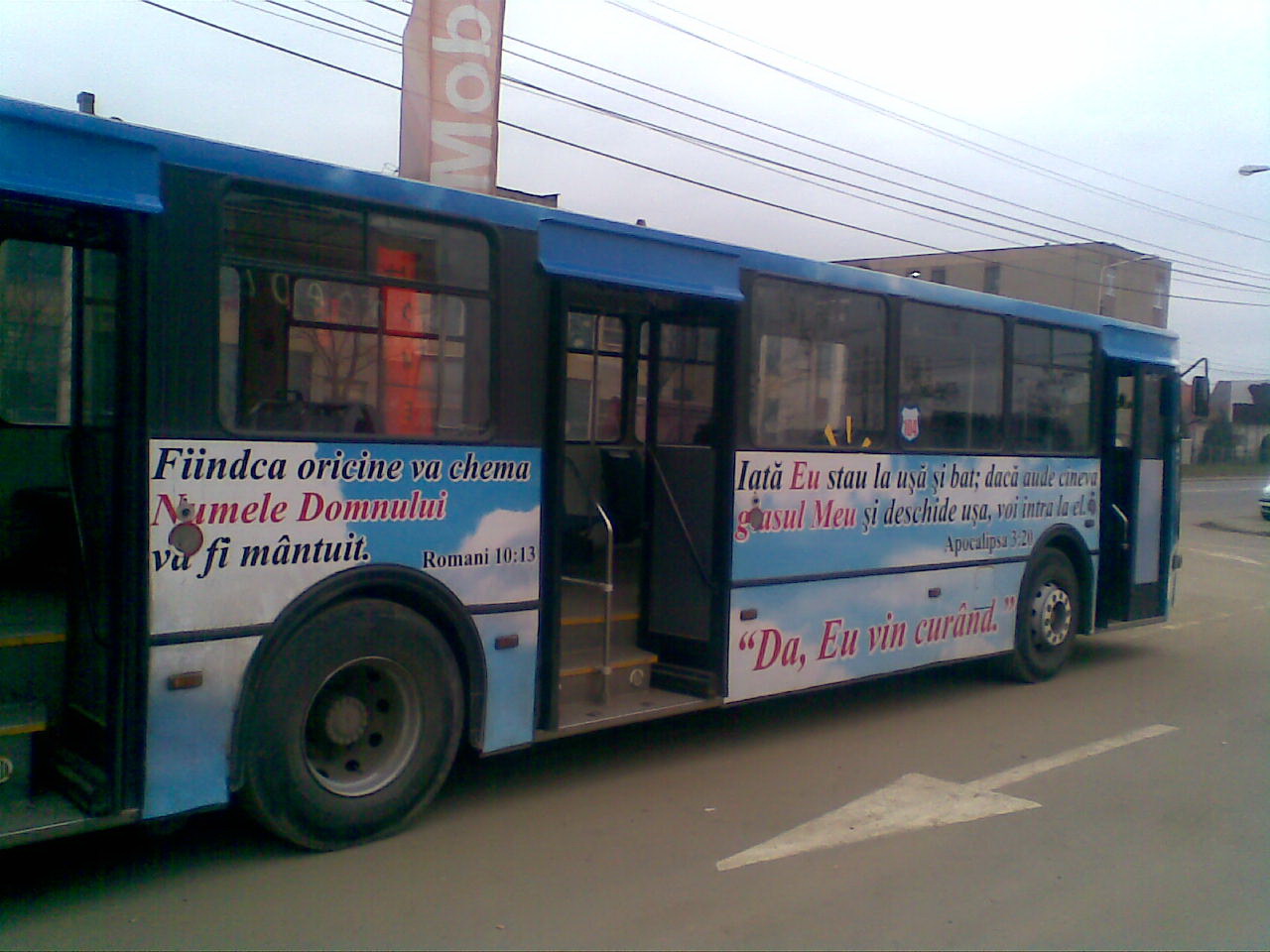 Haideti sa va arat un autobuz din Oradea (pozele le am de la doDdo). Hai sa fim seriosi pentru un minut. Da astia is chiar atat de cretini si dornici de brainwash incat au inceput sa ne picteze mijloacele de transport in comun cu citate din biblie ? In halul asta am ajuns, sa ne fie bagata religia pe gat? Astia merita batuti cu paru, merita batuti ca pe coasa. Nu priviti doar partea “divina” aici. Ce ar fi sa punem noi niste citate din carti despre Lucifer pe un singur autobuz ? Ma credeti ca cea mai mare mafie din lume o sa sara in sus simtindu-se foarte jignita (biserica evident)? Is atat de pornit pe ratatii care ne deranjeaza peste tot cu invitatii la tot felul de prostii, is atat de satul de prostii care canta in mijloacele de transport in comun de parca ne-ar interesa pe noi cantecele lor religioase, mi-e atat de scarba incat cred ca intr-o buna zi o sa cedez nervos si o sa ii bag in portbagaj si ii las in mijlocu unei paduri. Cand zic “deranjeaza” = te opreste pe strada si te “pune la curent”.