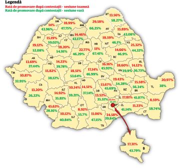 Daca sunt persoane pe care le intereseaza subiectul, am gasit pe GANDUL.INFO o harta a tarii cu rata de promovabilitate din prima si a doua sesiune – DUPA CONTESTATII evident.
