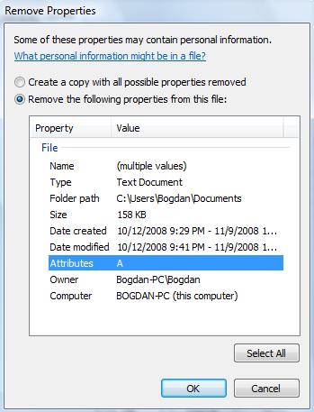 Selecteaza unul sau mai multe fisiere , CLICK Dreapta -> Properties -> Details si jos de tot veti gasi “Remove Propreties and Personal Information”